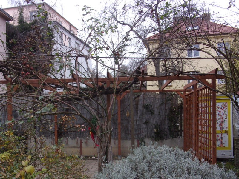 Konstrukce dřevěné pergoly byla dle zadání subtilní a nedoporučovali jsme ji zatěžovat zastřešením. Naopak ozdobné mříže Eva se ukázaly jako ideální doplněk. Nejen že vizuálně ladí s dřevěnou konstrukcí, ale poskytují i praktickou oporu pro vzrostlou vistárii, která bude pergolu v budoucnu zcela pokrývat.