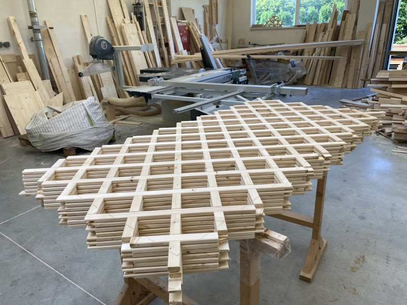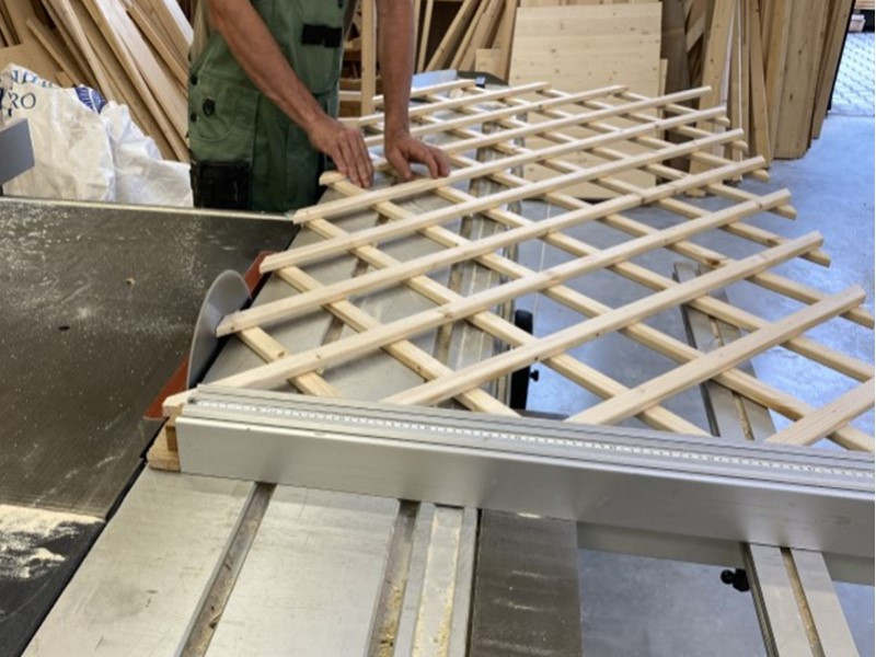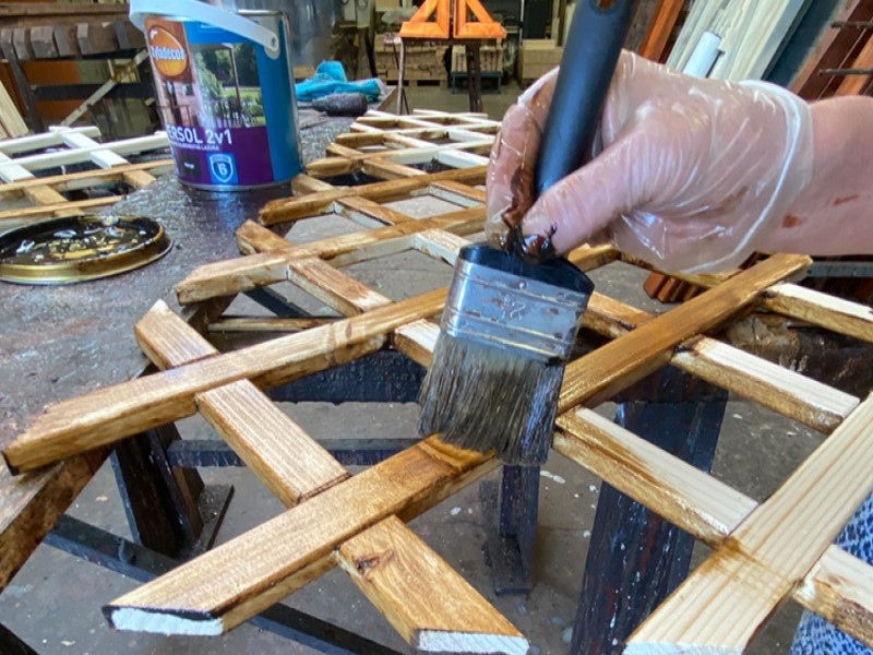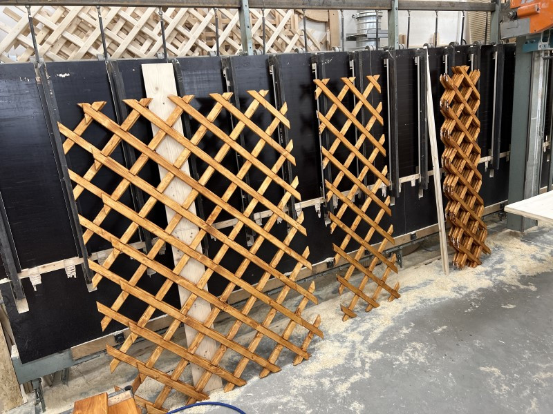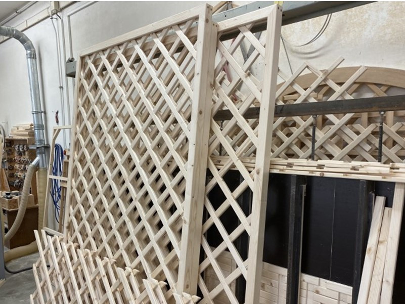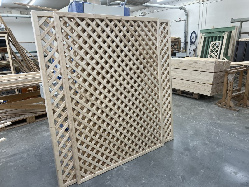 Mříže jsou vyrobeny z dokonale sušeného smrkového dřeva, latě o průřezu 1,5 × 3 cm jsou pevně sbíjeny sponkami a zasazeny do robustního rámu z hranolu 4 × 4 cm také ze smrkového dřeva. U paní Simony jsme instalovali dvě mříže o rozměrech 270 × 150 cm, povrchově ošetřené Xyladecorem Classic v elegantním odstínu ořech.
