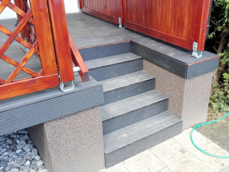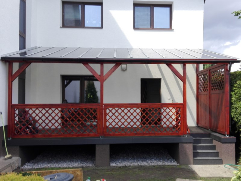 Boční stranu vyvýšené pergoly jsme pak uzavřeli dvěmi zástěnami Praktik. Tyto zástěny jsou tvořeny samostatně vsazovanými frézovanými prkny o rozměru 1,9 × 9,4 cm, zasazenými do silného rámu. Mezi jednotlivými prkny je ponechána 0,5cm mezera, což zajišťuje proudění vzduchu a zároveň při změně vzdušné vlhkosti může dřevo pracovat. Vrchní část zástěn byla navíc doplněna stejnou mříží, jaká byla použita na zábradlí.