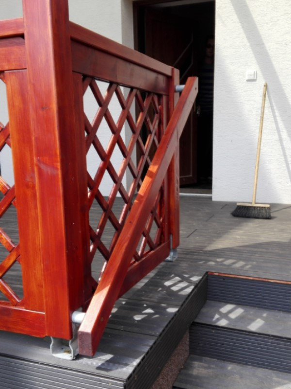 Pergolu jsme proto v přední části doplnili dvěmi mřížemi Tereza, které tvoří plátované latě na koso. Rozměry každé mříže byly upraveny na 250 × 90 cm, velikost oka 10 × 10 cm působí decentně, ale přesto zajišťují dostatečnou zábranu proti pádu. Latě jsou vyrobeny ze smrkového dřeva o průřezu 1,5 × 3 cm a jsou vsazeny do pevného rámu 4 × 9 cm. Horní část zábradlí jsme esteticky zakončili balkonovým madlem, které zvyšuje uživatelský komfort a přispívá k celkové pevnosti.