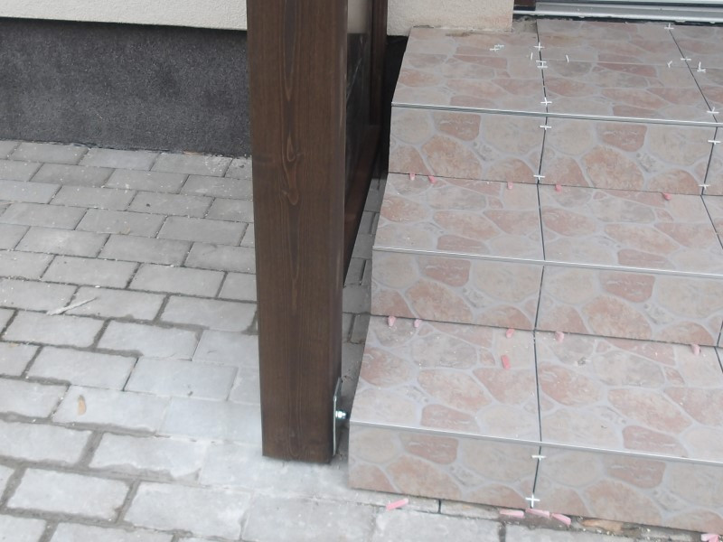 Dřevo bylo ošetřeno lazurou v odstínu palisandr, která ladí s tmavými prvky domu (okna, dveře) a zároveň poskytuje dlouhodobou ochranu. Polykarbonát komůrkový jsme na stříšku přichytili oblými eloxovanými lištami, pod které jsme vložili pryžové těsnění, aby nedocházelo k nežádoucímu zatékání. V místě napojení stříšky na zeď jsme použili těsnicí plech, který zabraňuje zatékání srážkové vody. Strany polykarbonátu jsou navíc zakončeny „U“ profilem se zvýšenou hranou, což ještě více omezuje pronikání vlhkosti.