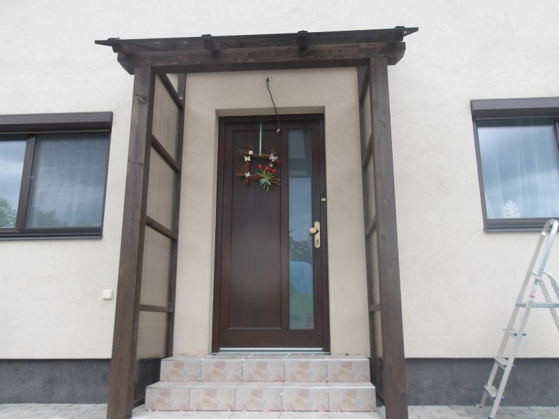 Stříška nad dveře s bočnicemi byla navržena s pultovou střechou a boční zástěny vyplněny kouřovým polykarbonátem o síle 8 mm, které nejen chrání před větrem a deštěm, ale zároveň dodávají celému prvku moderní vzhled bez zbytečného zatemnění.