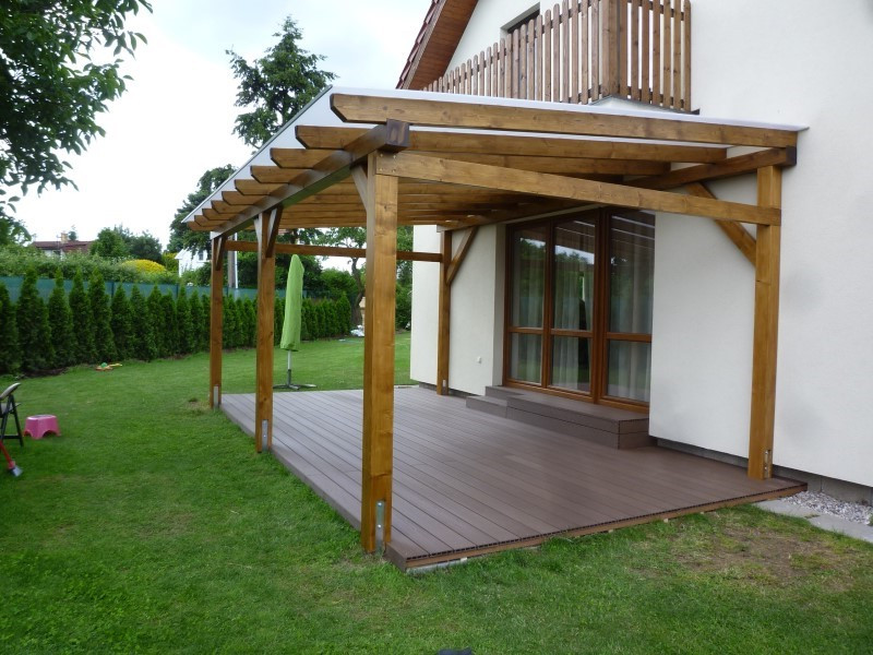 Nad podlahou vyrostla samostatně stojící dřevěná pergola o rozměrech 2,5 × 5 metrů, která poskytuje příjemný stín i ochranu proti nepříznivému počasí. Konstrukce je vyrobena z lepených BSH smrkových hranolů, které byly opatřeny lazurou v odstínu třešeň – ladí tak s okolím domu i zahradou.