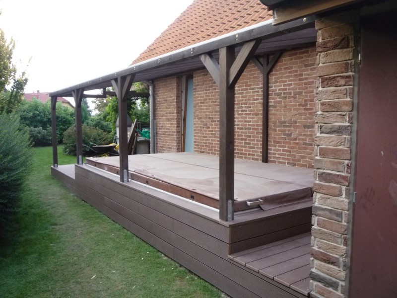 Aby si náš zákazník mohl vychutnávat relaxaci i během deštivých dní nebo za ostrého slunce, doplnili jsme novou podlahu o samostatně stojící dřevěnou pergolu.