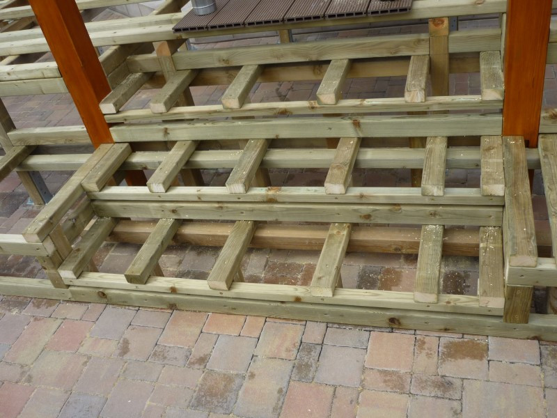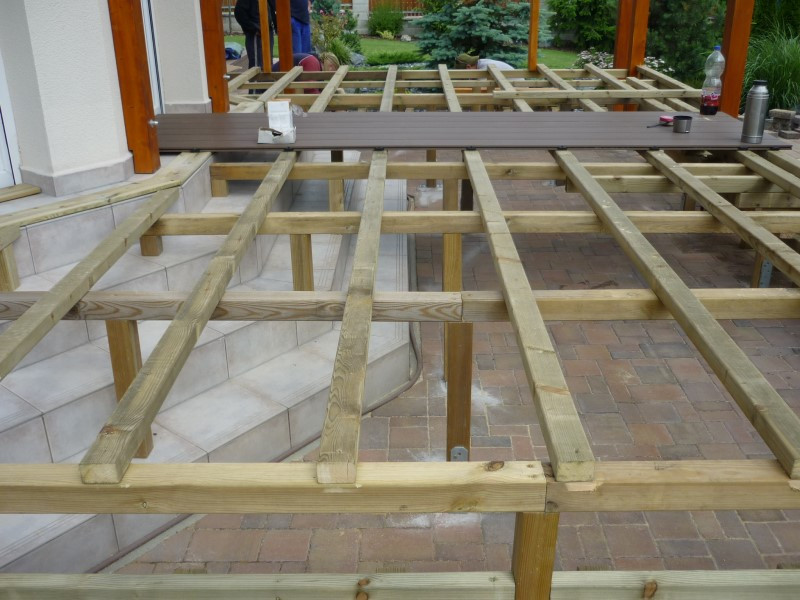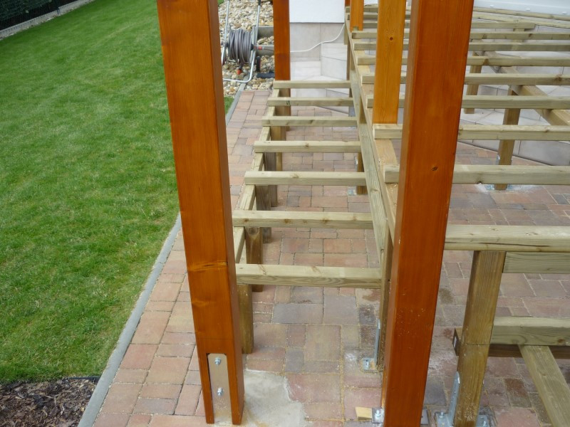 Původní terasa byla z klasické zámkové dlažby uložené níže než podlaha domu. Pro dosažení jednotné výškové úrovně jsme zhotovili pevný rošt z impregnovaných trámků, který zároveň slouží jako nosná konstrukce pro novou podlahu. Tento rošt jsme pečlivě ukotvili pomocí podlahových úchytů, aby celá plocha zůstala stabilní a pevná po mnoho let.