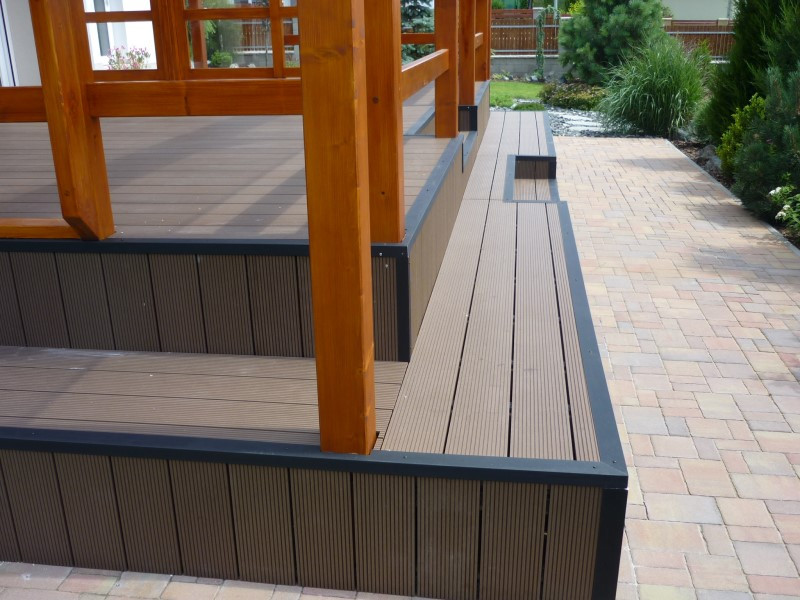 Díky protiskluzové úpravě povrchu je podlaha bezpečná i za deště. Jednoduché čištění vodou a mýdlem je vše, co budete potřebovat. Prkna jsme ke konstrukci připevnili pomocí plastových spojek s nerezovými vruty, čímž jsme zachovali nejen pevnost, ale i přesné dilatační mezery mezi jednotlivými dílci. Olemování hliníkovou lištou v tmavě hnědém odstínu dodalo podlaze čistý a elegantní vzhled.
