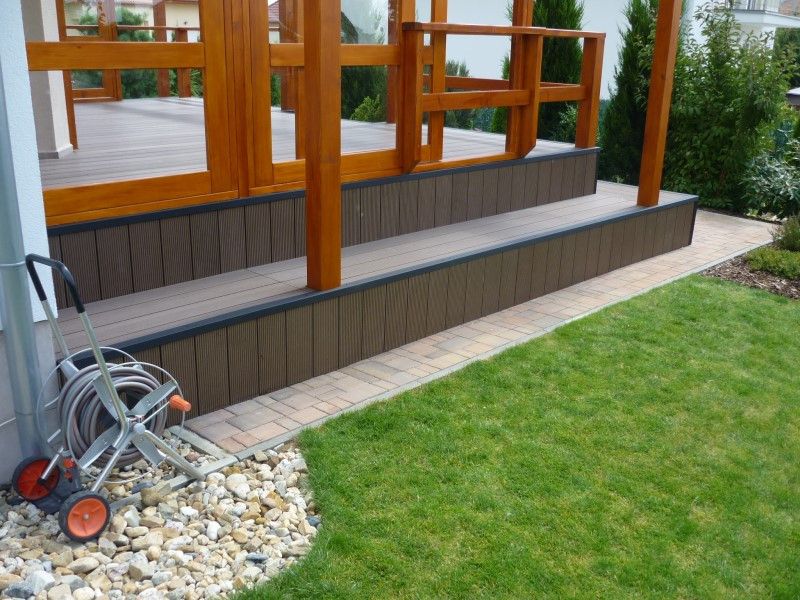 Navíc jsme kompozitní prkna použili i na schodiště vedoucí do zahrady, takže celek působí velmi kompaktně a promyšleně.