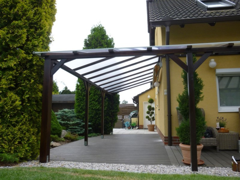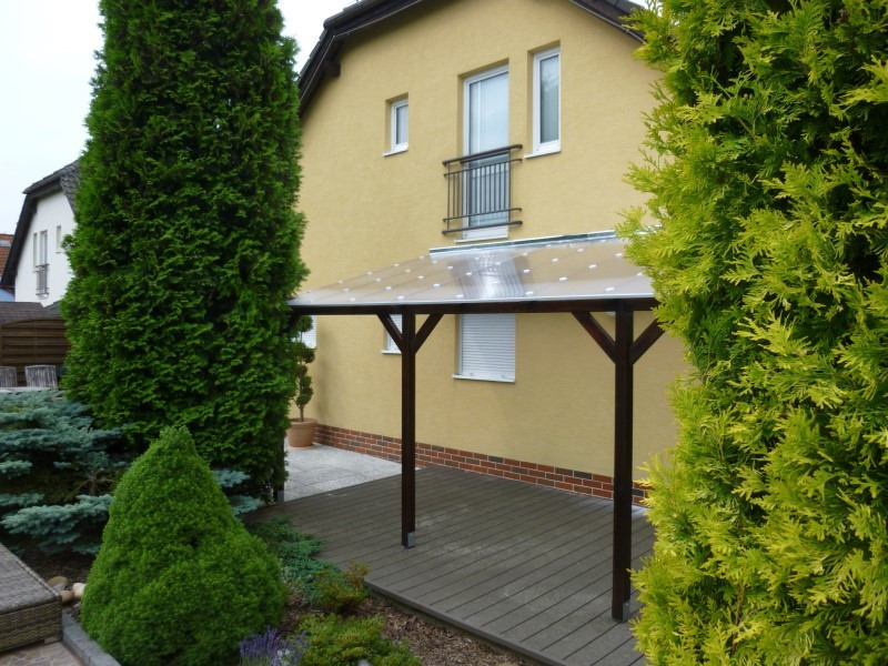 Pergolu jsme zastřešili komůrkovým polykarbonátem, který propouští světlo, ale zároveň chrání před přímým sluncem, deštěm i větrem. Polykarbonát je připevněn pomocí Fasto šroubů s podložkami a krytkami, které zajišťují pevné uchycení a zároveň zabraňují zatékání vody. Mezera mezi střechou a zdí domu byla utěsněna pozinkovaným plechem, takže celá konstrukce je chráněná i v případě silného deště.