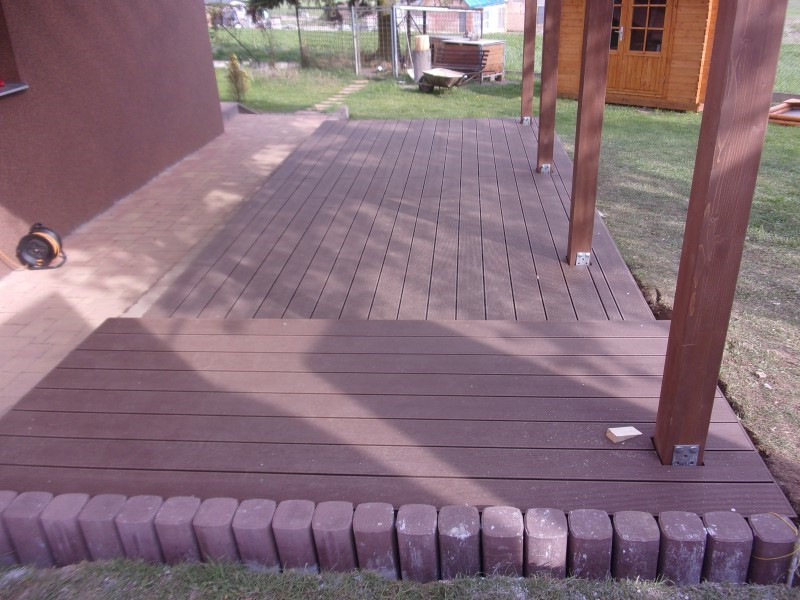 Zajímavostí této zakázky bylo, že se terasa pokládala ve svažitém terénu, což si vyžádalo vytvoření dvou výškových úrovní. Před samotnou montáží bylo nutné část pozemku odbagrovat a zpevnit podloží. Teprve poté bylo možné sestavit podkladní rošt z WPC nosných profilů, jehož výškové rozdíly jsme vyrovnávali pomocí gumových podložek.