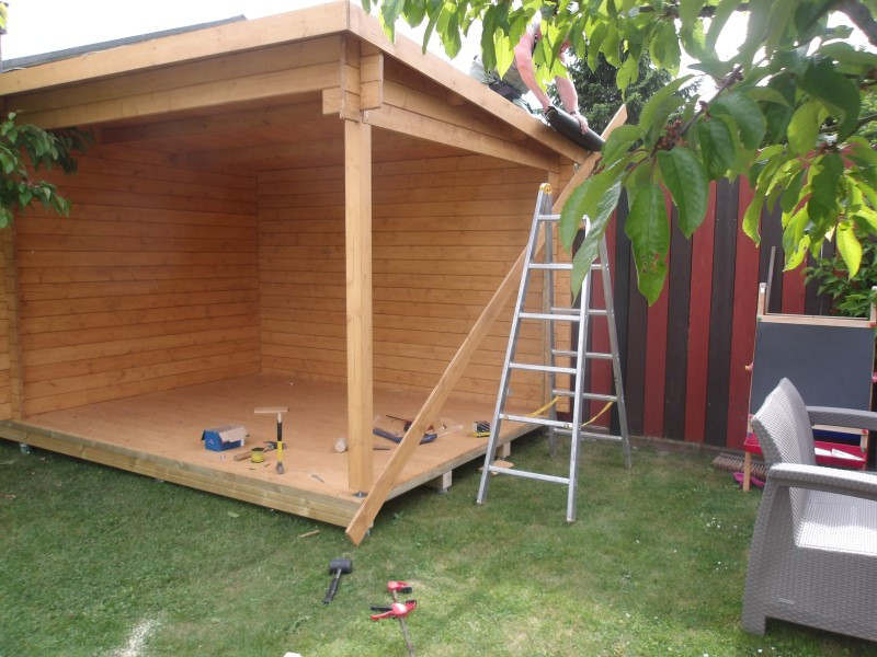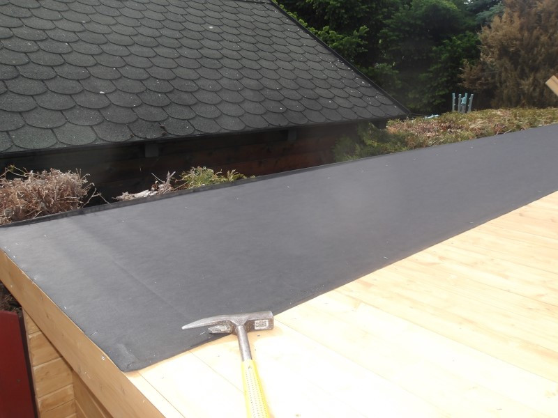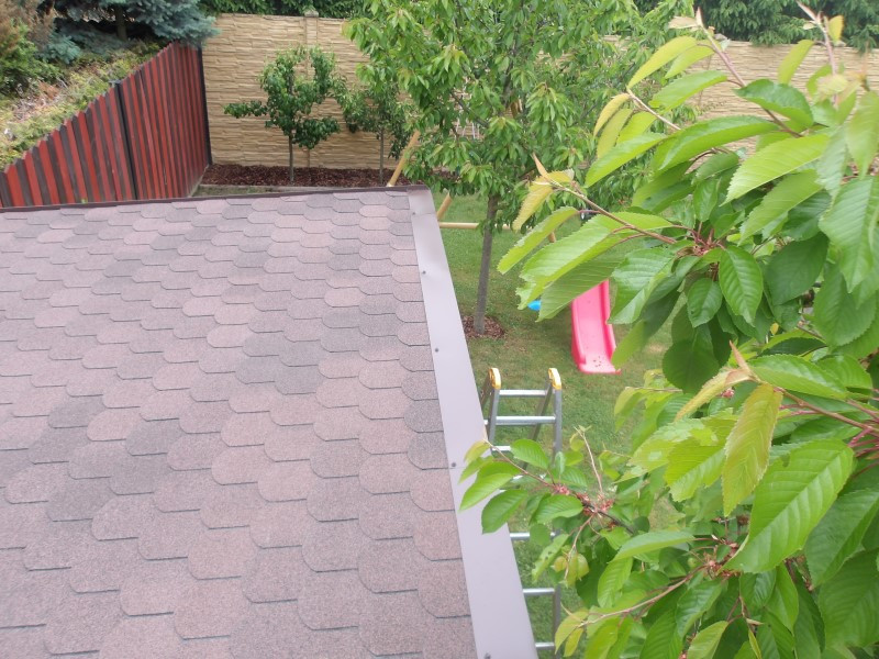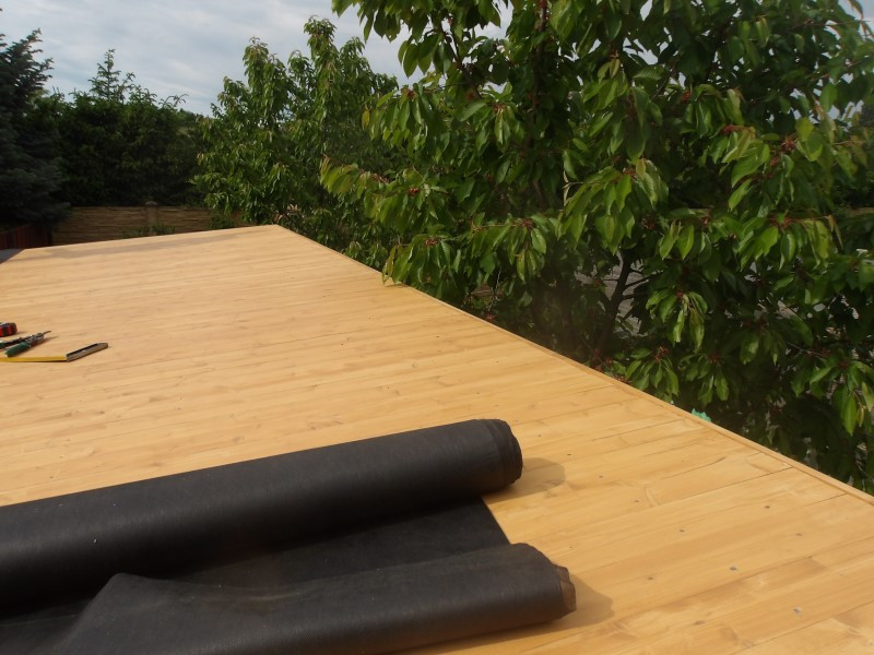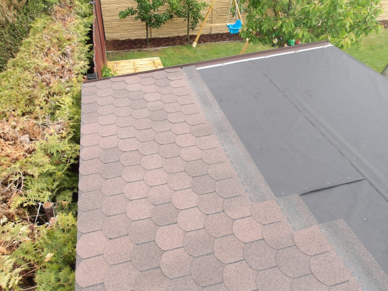 Freddy má pultovou střechu – elegantní, jednoduchou a hlavně praktickou. Střešní palubky s drážkami po celé délce se spojovaly jako máslo, pak už jen podkladový izolační pás a asfaltový šindel ve tvaru bobrovky v hnědé barvě a bylo hotovo! Lemování třemi pruhy hnědého plechu, okapnice a okapový set v zadní části zajišťují, že voda půjde, tam kam má – a ne kam nemá.