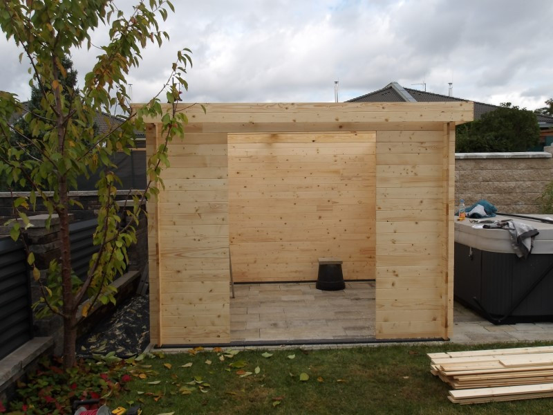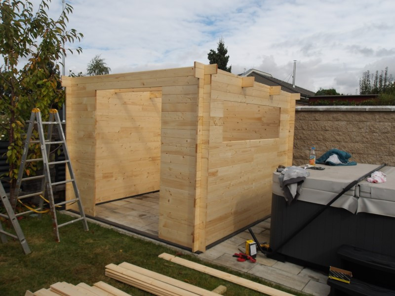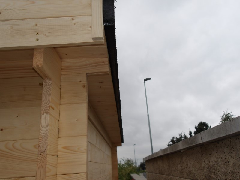 Stěny tvoří prkna o síle 28 mm se systémem pero–drážka se zámky, díky kterému jednotlivé díly přesně zapadají do sebe. Sestavení dřevěné chatky je tak rychlé, pevné a bezproblémové. Stejným způsobem se skládá i rovná střecha z palubek s vyfrézovaným zámkem.