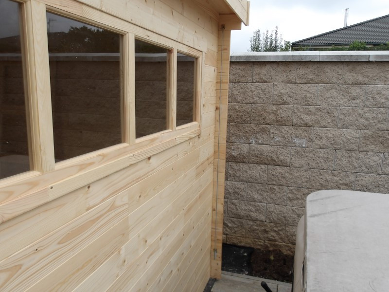 Zahradní chata Bodine se standardně dodává bez podlahy, což v tomto případě vyhovuje – bude umístěna přímo na připravené vydlážděné ploše. Pro lepší oddělení chaty od podkladu jsme přidali podkladový hranol z tvrdého plastu, který brání nasávání vlhkosti do dřeva.