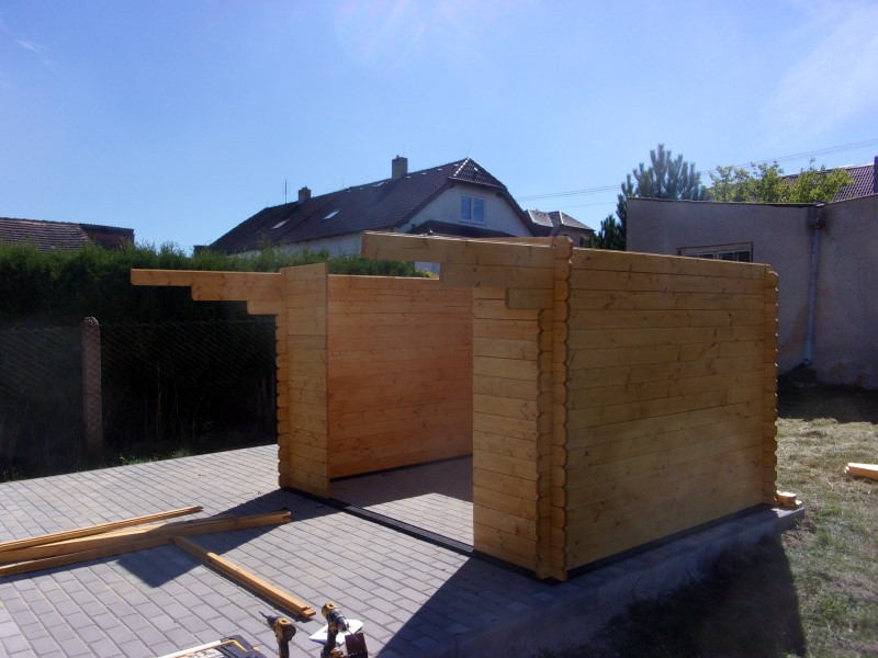 Všechny dřevěné prvky jsme v naší lakovně ošetřili povrchovou úpravou – jedním nátěrem impregnace a následně dvěma vrstvami lazury v teplém odstínu cedr, který chatu krásně sladil s okolím. Montáž jsme započali sestavením základového hranolu z tvrdého plastu. Následovala montáž stěn z hoblovaných smrkových prken s vyřezanými zámky. Zámky do sebe perfektně zapadají a stěny jsou smontovány za chvíli. Při stavbě střechy jsme rovněž nenarazili na žádné problémy. Opět se jednalo o jednoduché zapasování jednotlivých střešních palubek do připravených zámků.