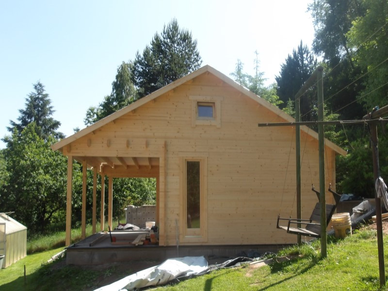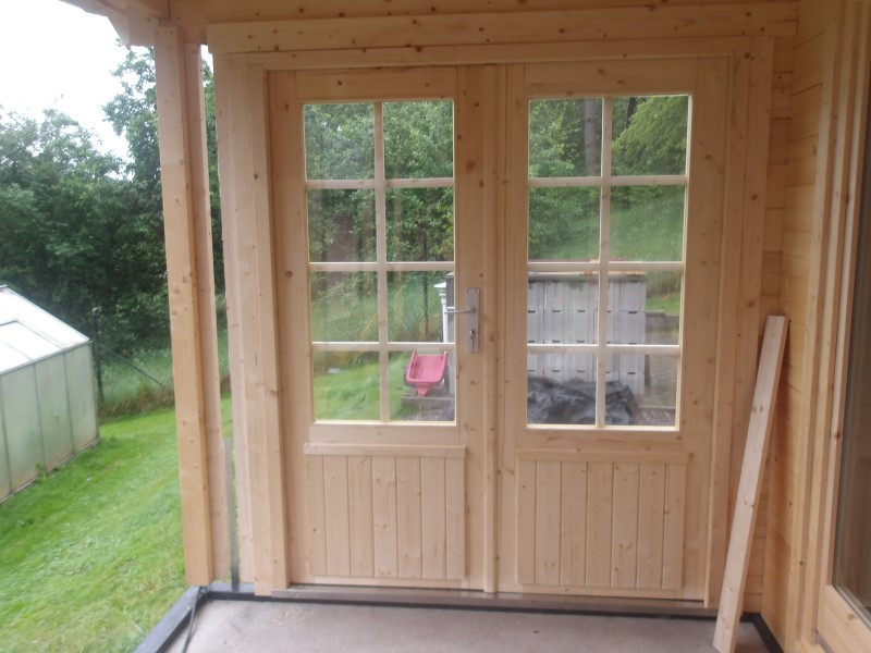 Po výběru chaty si pan Jiří přál několik úprav na míru – dvě menší okna do štítu a dvoukřídlé prosklené dveře navíc, které povedou z prosklené terasy do zahrady. Protože si zákazník chtěl chatku natřít sám a plánoval si také sám položit střešní krytinu, smontovali jsme mu chatu v základním provedení bez povrchové úpravy.